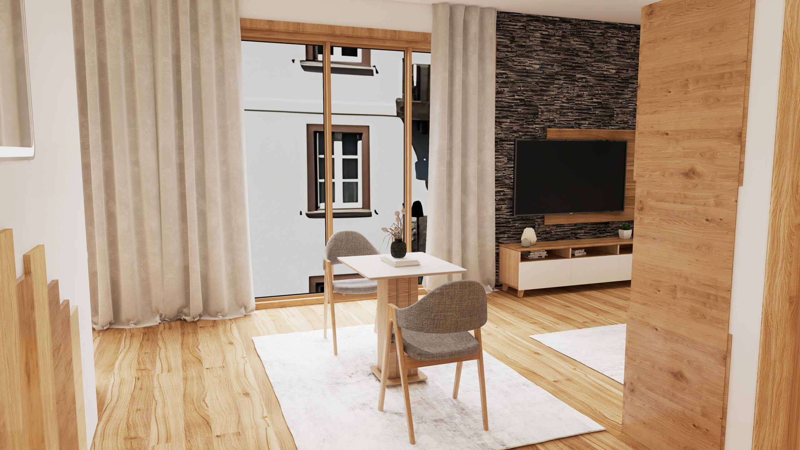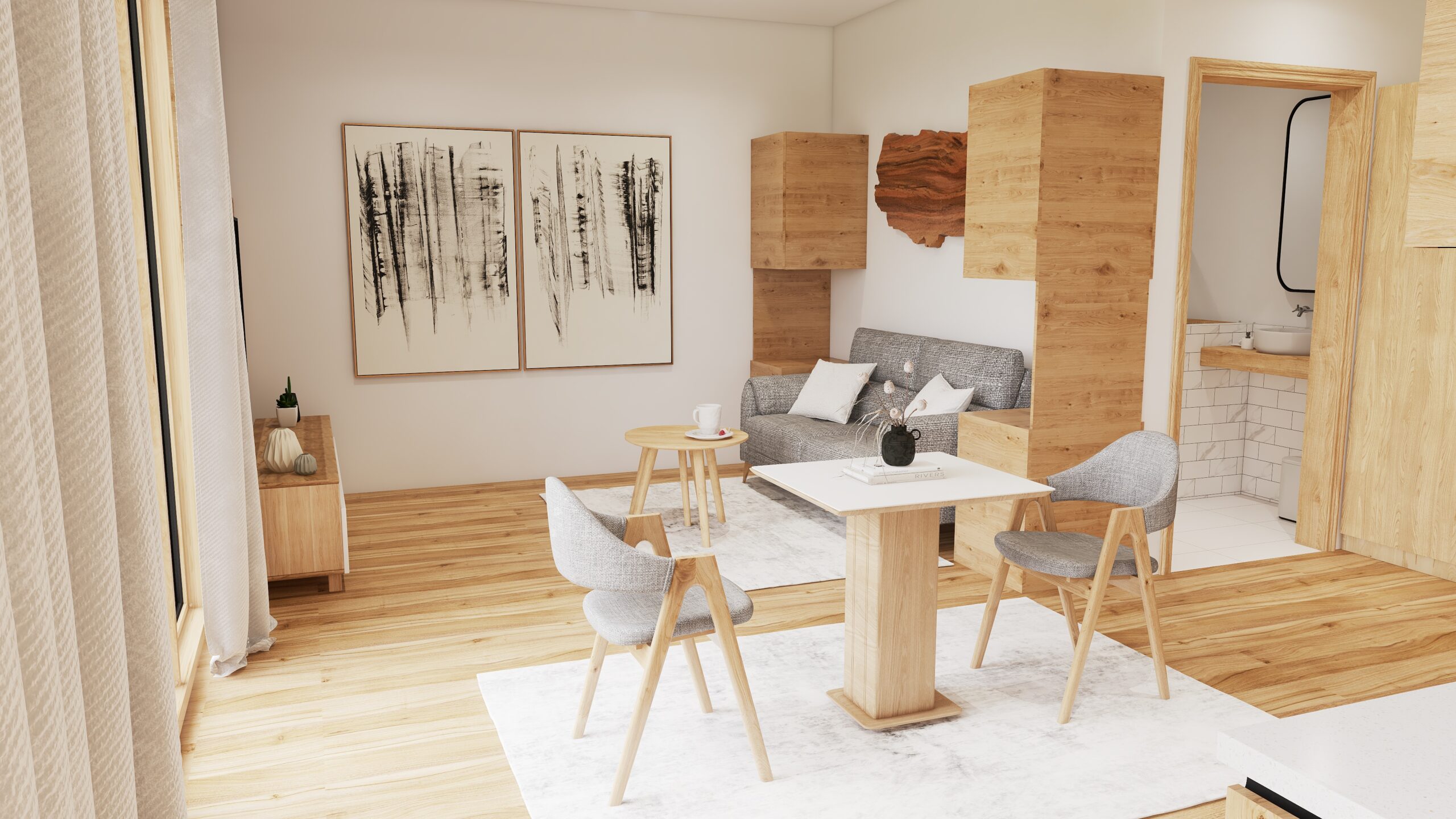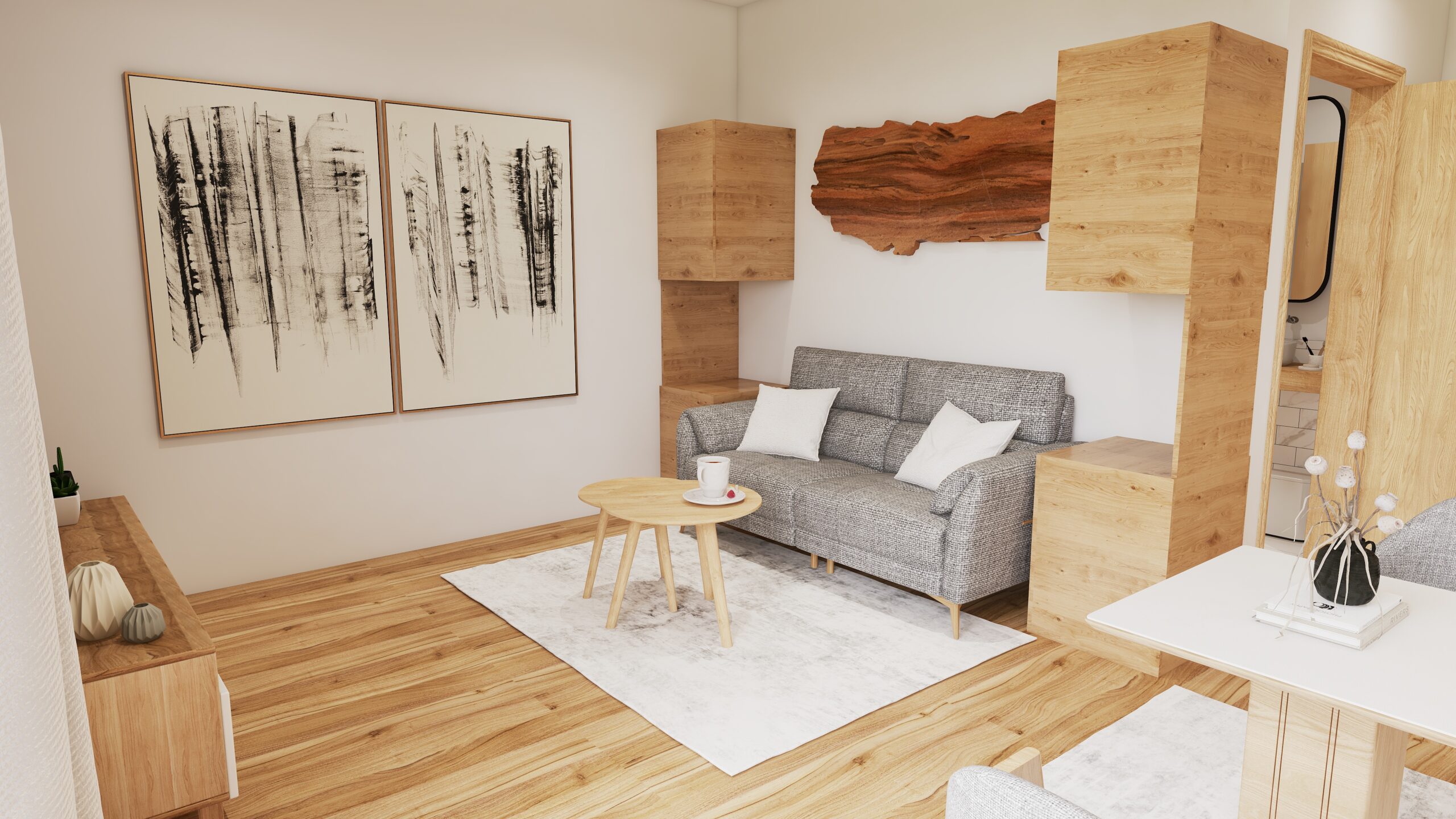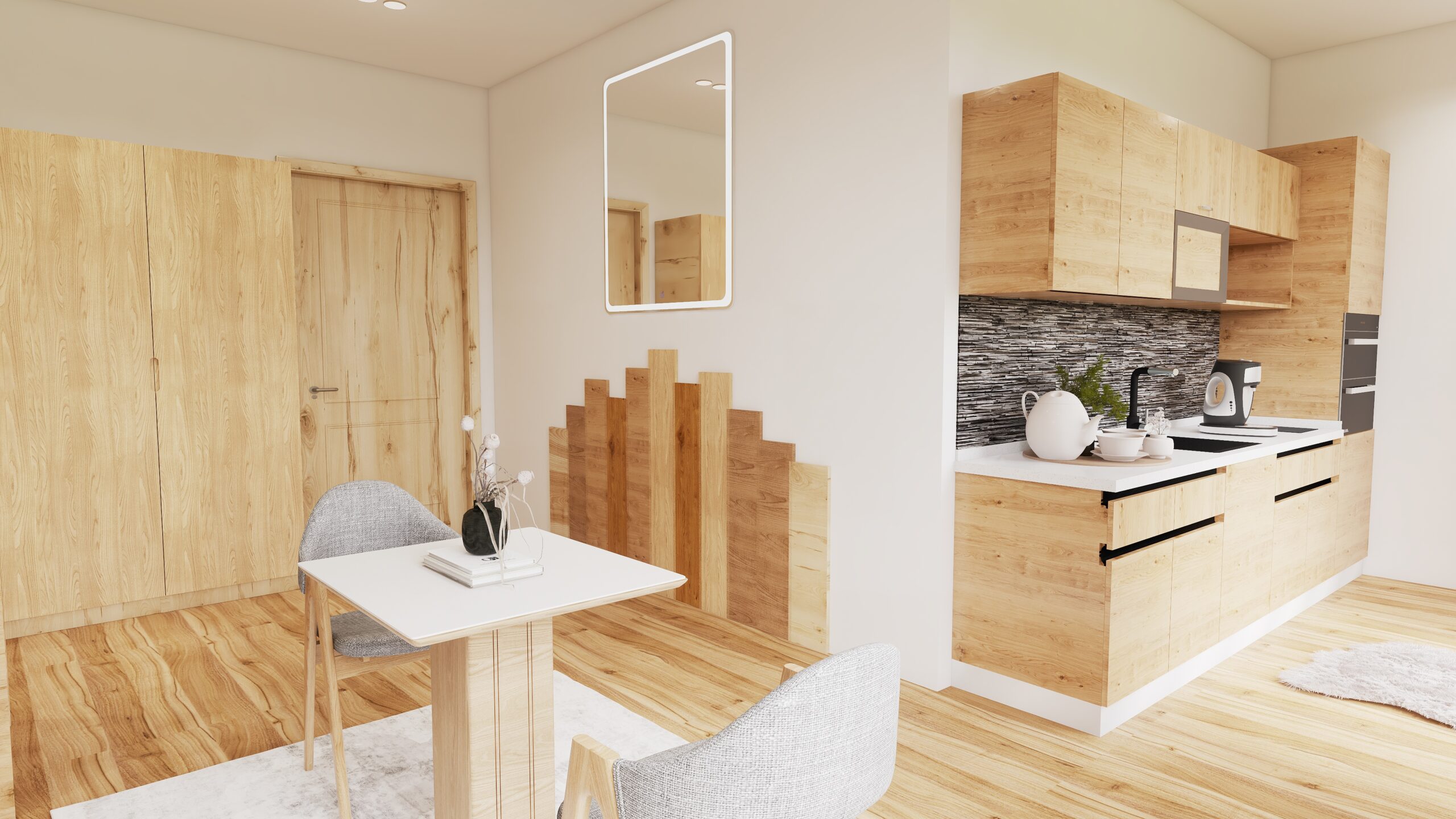 Auf 43 m²* entfaltet sich ein Wohngefühl, das überrascht: offen, harmonisch, großzügig gedacht. Der Wohn- und Schlafbereich verschmilzt mit einer stilvoll integrierten Kaffeeküche, die kleine Genussmomente ermöglicht. Perfekt für einen Kaffee, frisches Brot oder regionale Köstlichkeiten - oder für Spezialitäten in Ihrem Hotelstudio, vom hauseigenen Restaurant. Der Balkon bietet Entspannung in der milden Nachmittagssonne, hört das leise Leben des Dorfes unter sich, sieht die Berge im warmen Licht glühen. Ein Glas Wein aus dem nahgelegenen Supermarkt, ein tiefer Atemzug - und der Tag bekommt plötzlich eine neue Qualität: leichter, ruhiger, wertvoller.