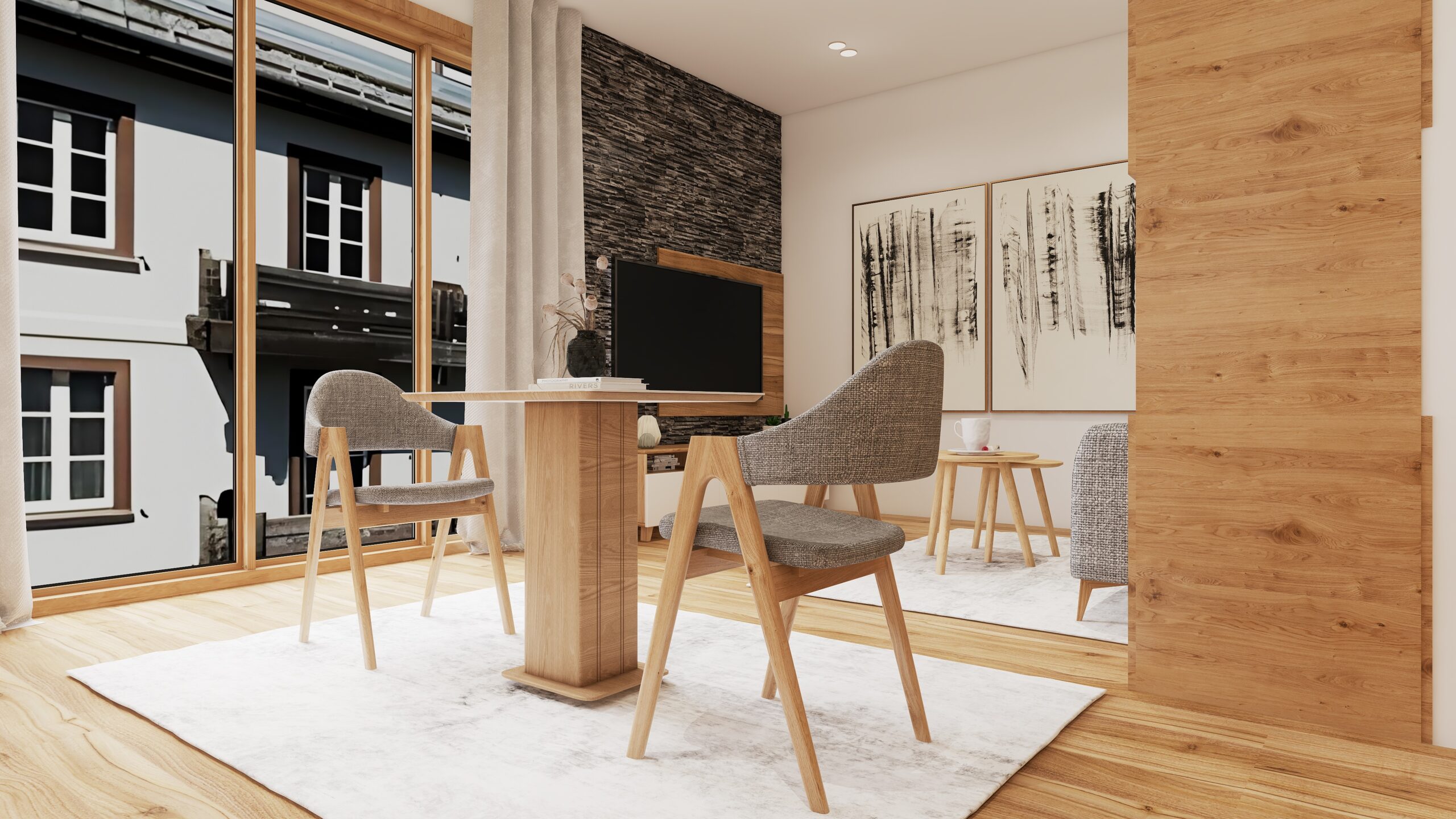 Auf dem 2. Obergeschoss, öffnen Sie die Tür zum Hotelstudio 212 - und sofort entsteht dieses besondere Gefühl, wenn Licht, Raum und Ruhe perfekt zusammenspielen. Die Westausrichtung schenkt dem Hotelstudio ab dem frühen Nachmittag ein warmes, goldenes Leuchten. Sonnenstrahlen malen weiche Reflexe auf Holz, Stoffe wirken tiefer, Farben sanfter. Durch die erhöhten Fensterfronten breitet sich ein Panorama aus: die Dächer von Saas-Fee, der historische Hotel Dom, der im Abendlicht aussieht, als hätte er seine ganz eigene Geschichte zu erzählen - voller Eleganz und alpinem Charakter.